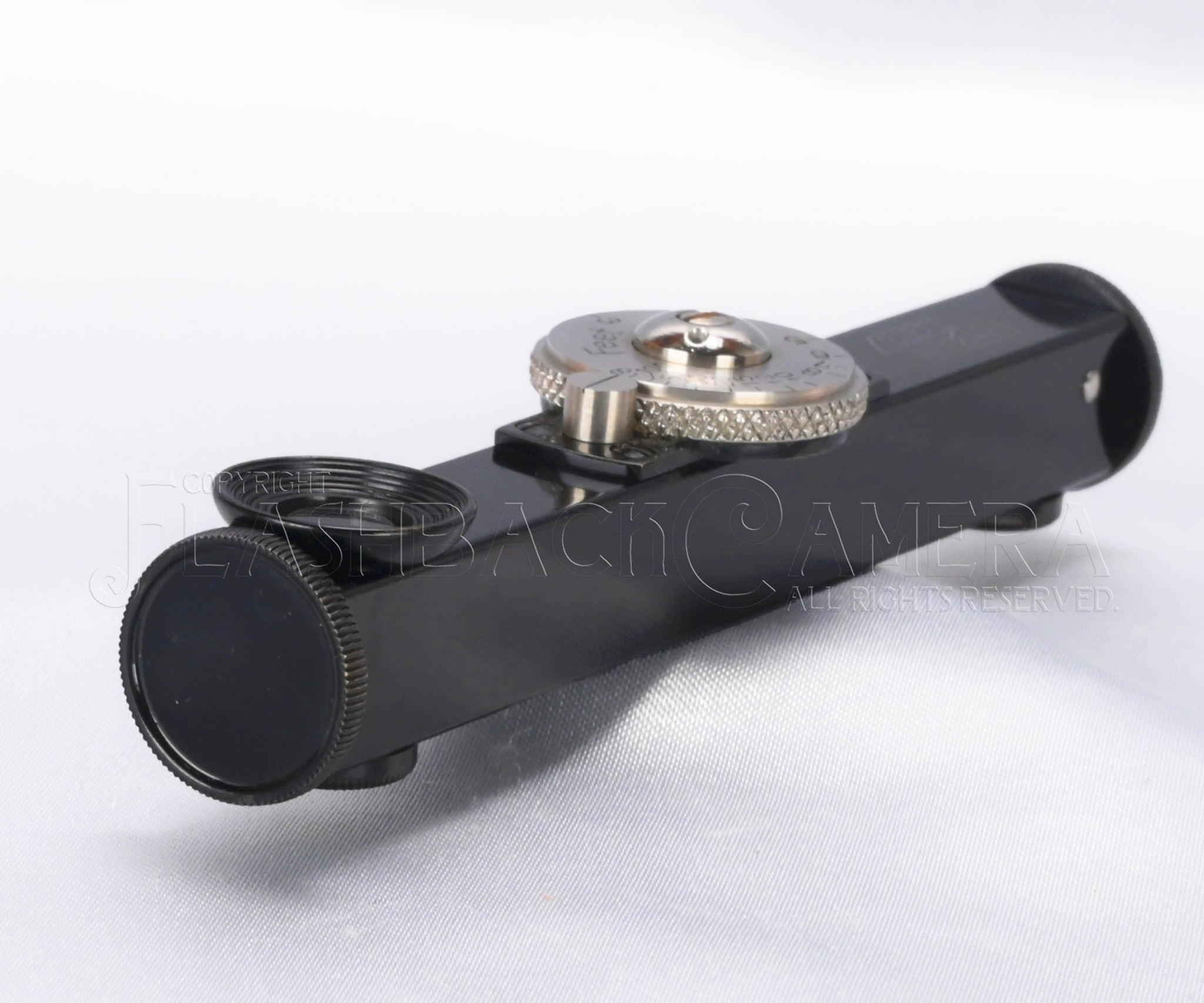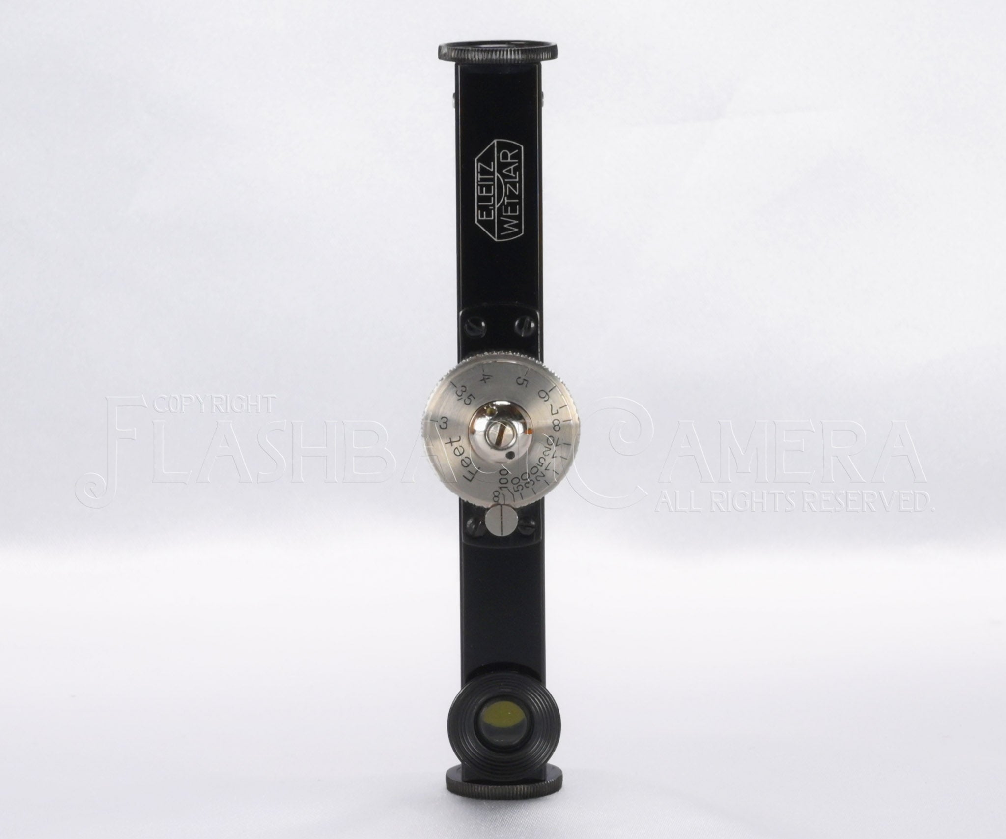 黒塗りボディにニッケルメッキのダイヤルが美しく、六角のE.Leitzロゴの銀象嵌も格調高さを醸し出しています。精密感と高級感に溢れる、戦前ライツならではの逸品。基線長83mmでかなり正確に計測できます。