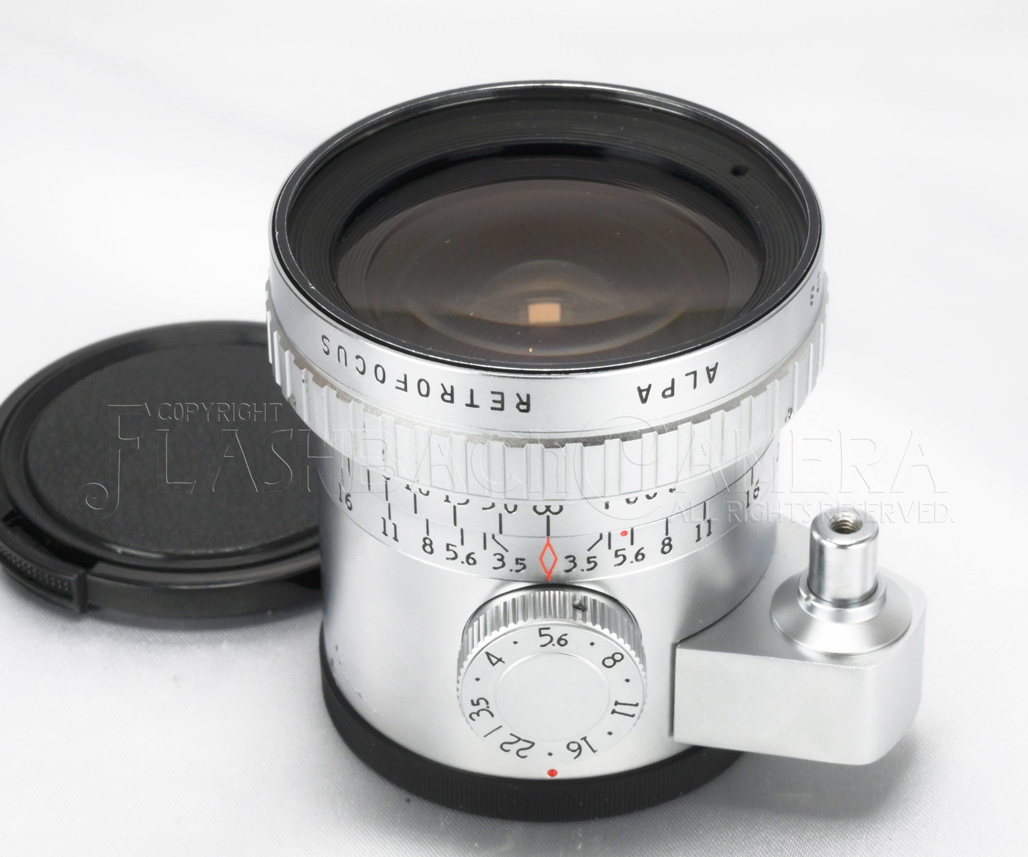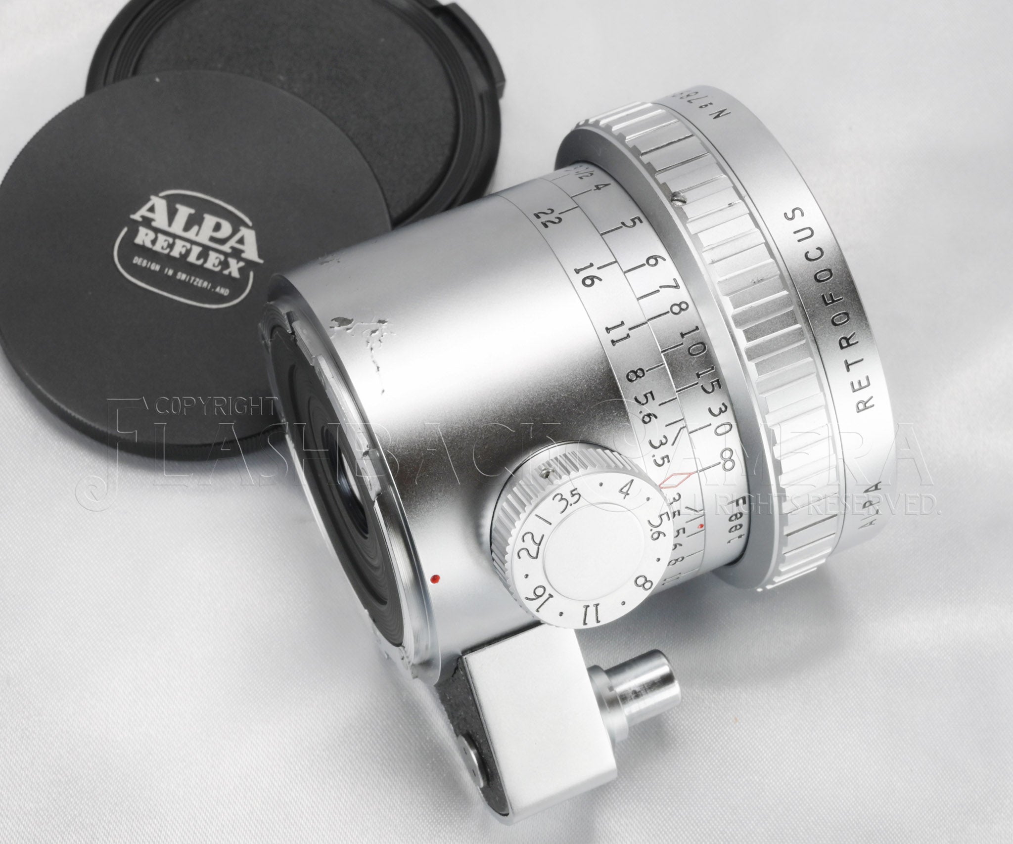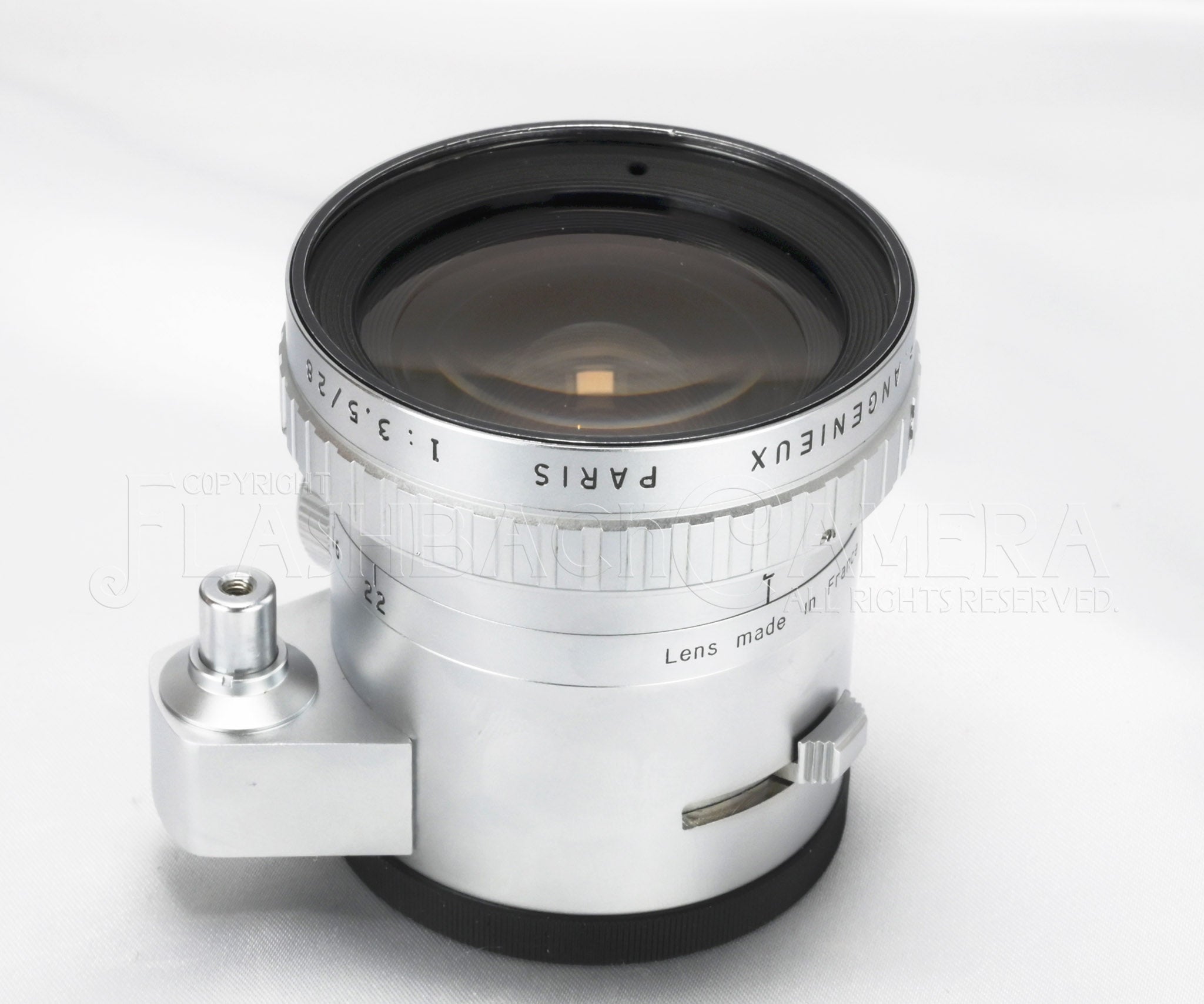 仏アンジェニュー製広角レンズ、28mm f3.5 Type R11。アルパ用の自動絞りバージョンです。タイプR11は1953年に登場しました。本品は1960年製。6群6枚構成のレトロフォーカス設計。やや光沢感がある梨地クローム仕上げ。数はやや少ないですが、この自動絞りバージョンで黒鏡胴バージョンも存在します。