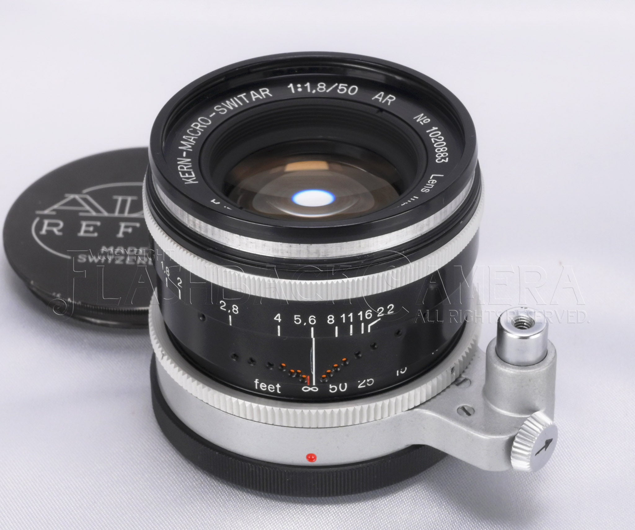 スイス・ケルン社製マクロスイター 50mm f1.8。1958年に登場、1969年までアルパ用標準レンズとして活躍しました。シネレンズ専業メーカーのケルン社が製造した、数少ない写真用レンズ。5群7枚のアポクロマート・レンズ。距離表記はfeet。