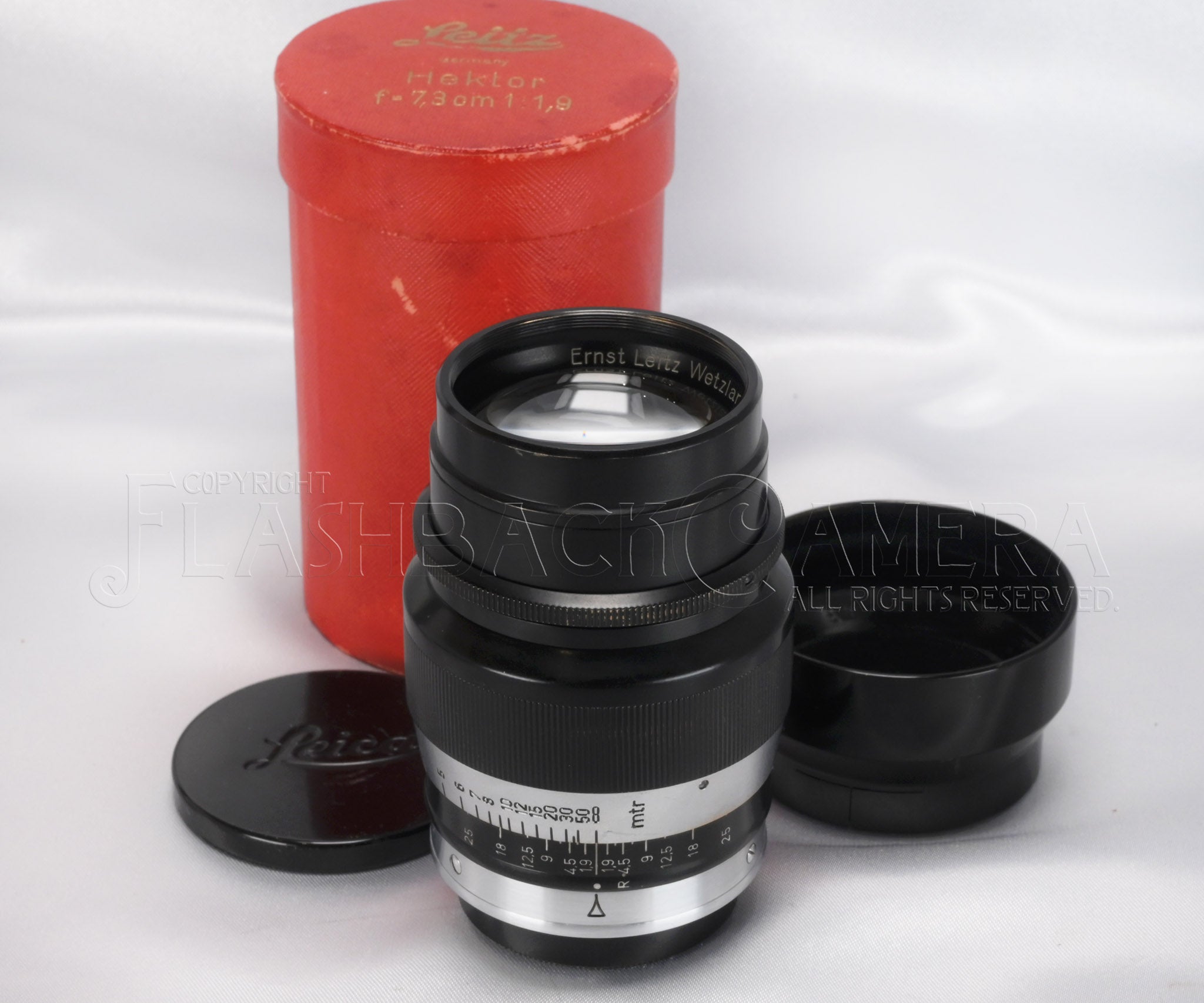 銘玉ヘクトール 73mm f1.9。木村伊兵衛など著名写真家も愛用していた、戦前のライツを代表する大口径中望遠レンズ。ライツのコード名はHEKON。本品はブラック/クローム仕上げ。製造番号は43万台、1938年の製造です。距離表記はメートル。回転ヘリコイド。本品は外観、ガラス共にとびきり綺麗な一本。