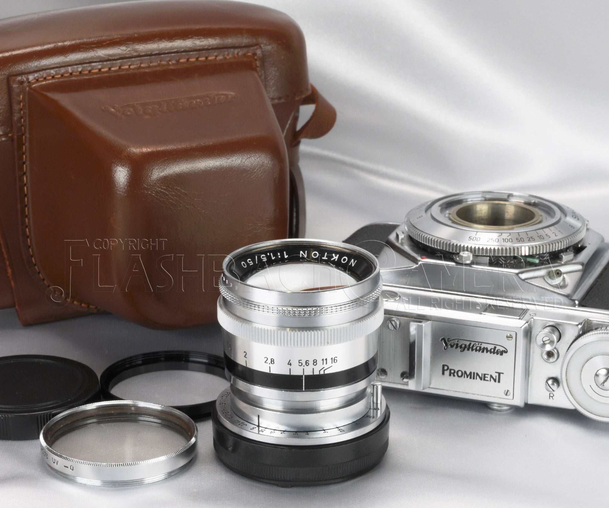 独フォクトレンダーの銘玉、ノクトン 50mm f1.5。プロミネント戦後モデル用の標準レンズ。本品は1955年製の前期型。お探しの方も多い、Amedeo製の距離計連動アダプターが付属し、ライカM型で撮影をお楽しみ頂けます。フィルターは47mmねじ込み、または内ネジの49mmが適合。