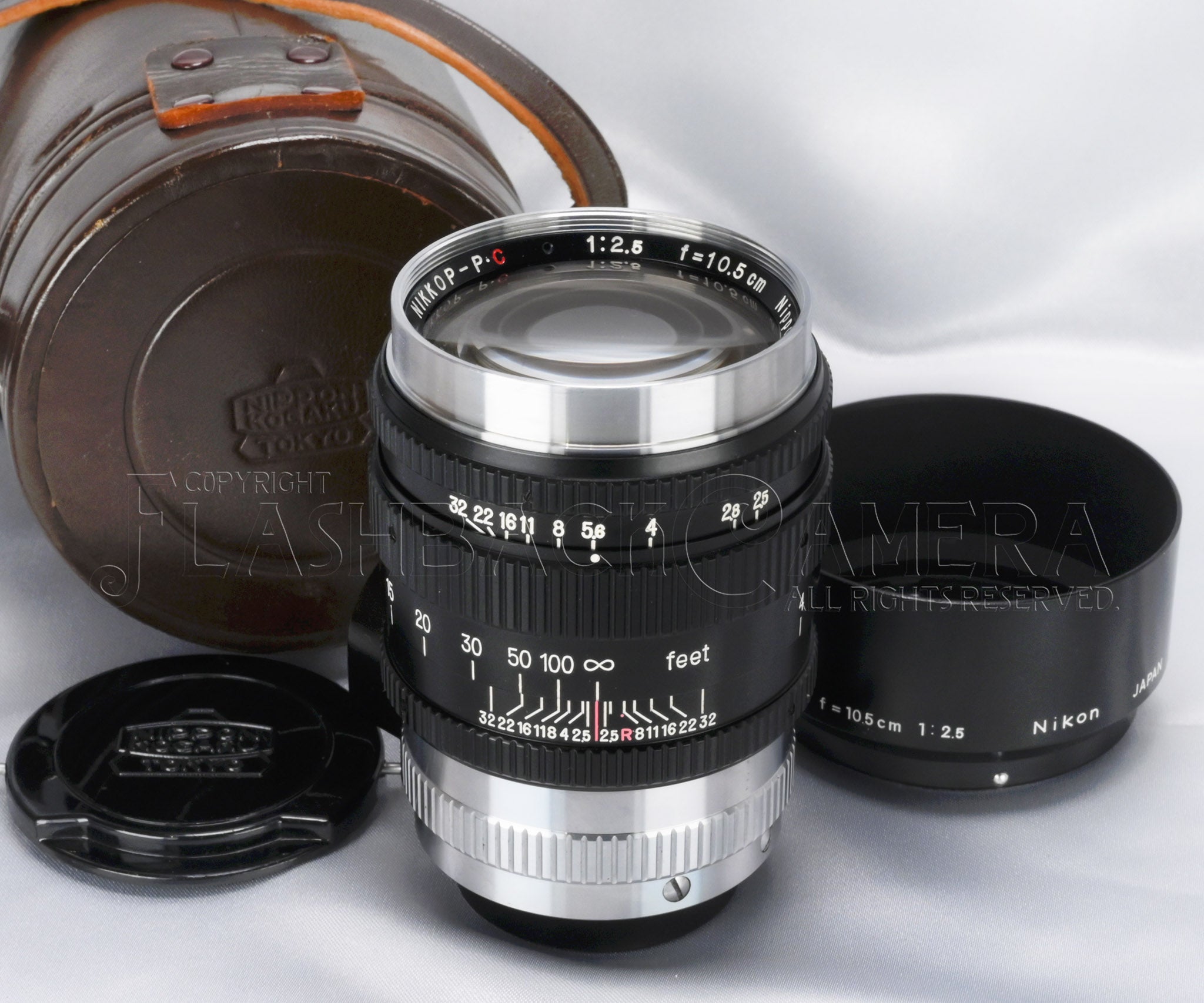 ニッコール-P.C 105mm f2.5。ライカ・スクリューマウント。フード固定用のツノがない後期型。レンズ構成は3群5枚のゾナー型。