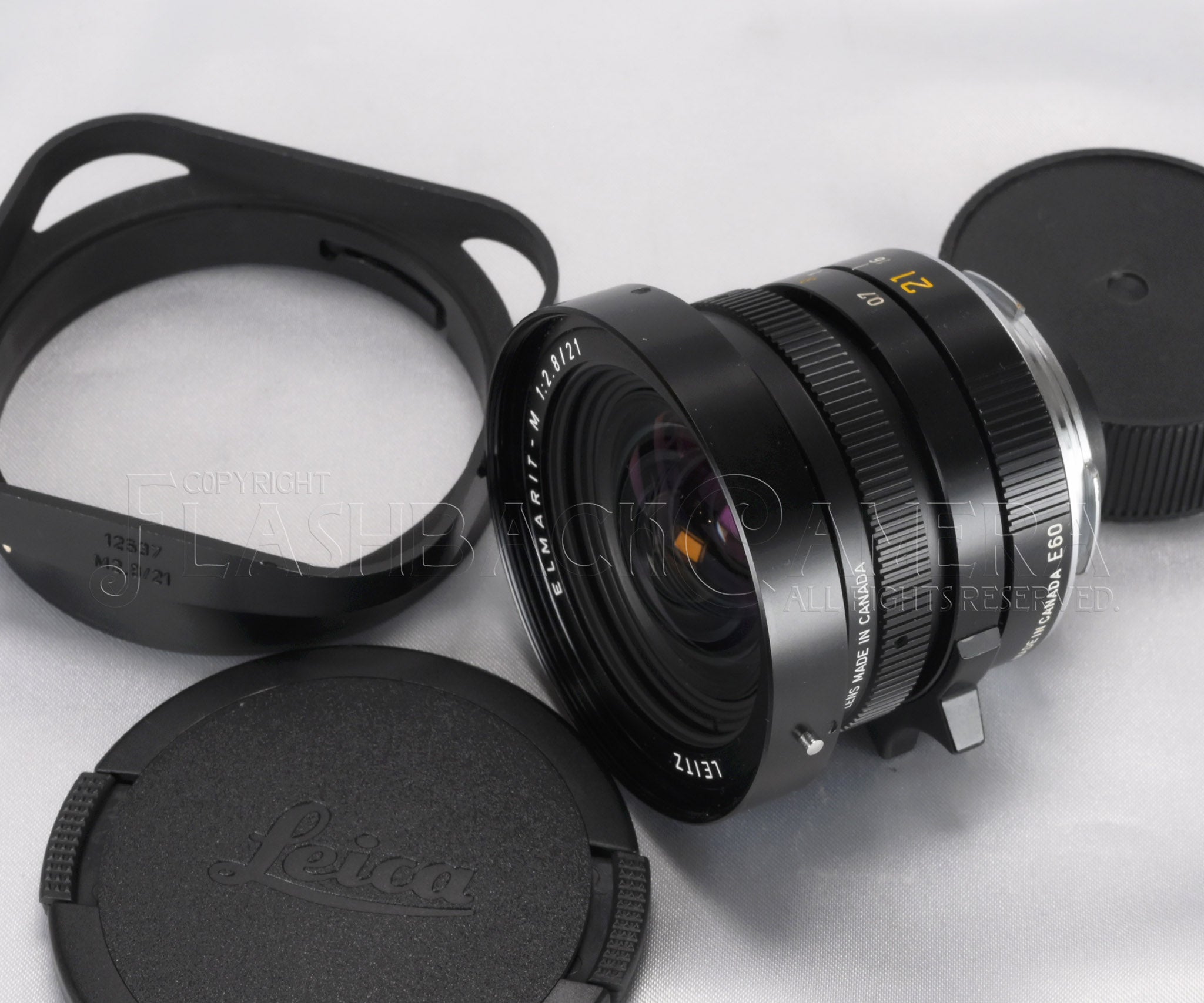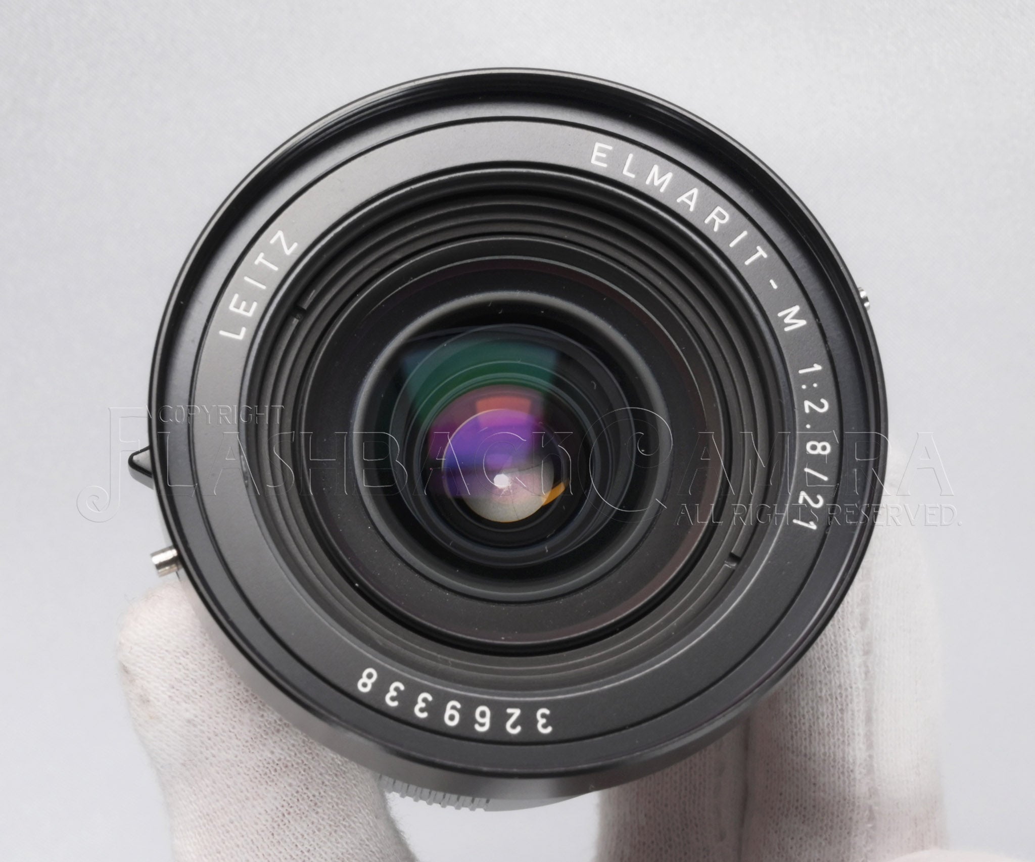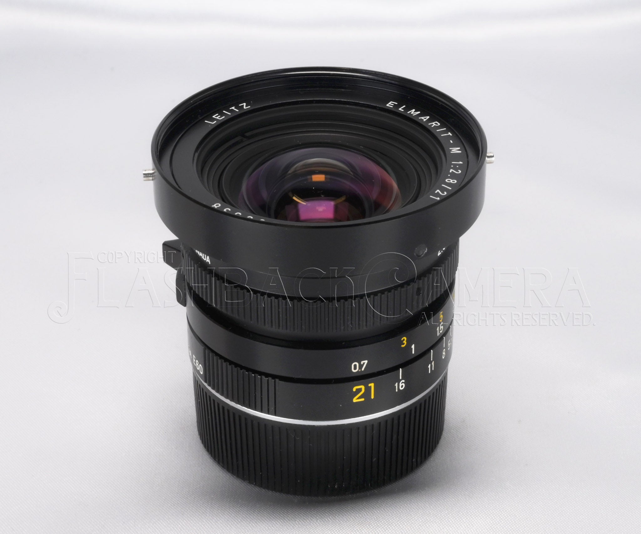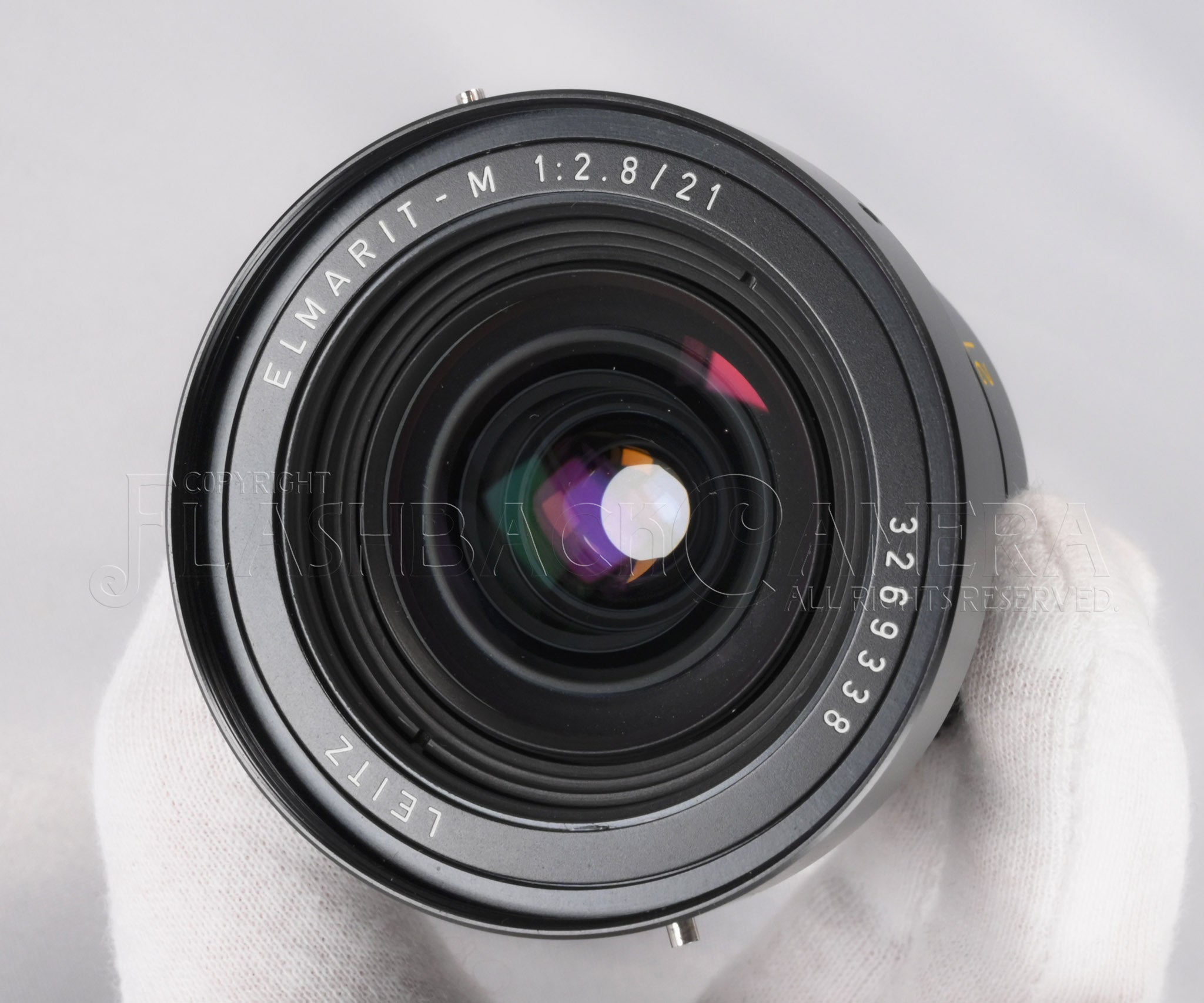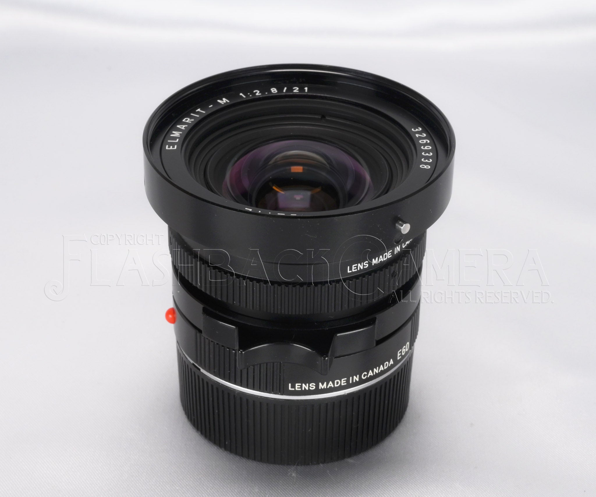 超広角レンズ、エルマリートM 21mm f2.8。シリアル番号は326万台、1983年製。カナダライツによる製造です。