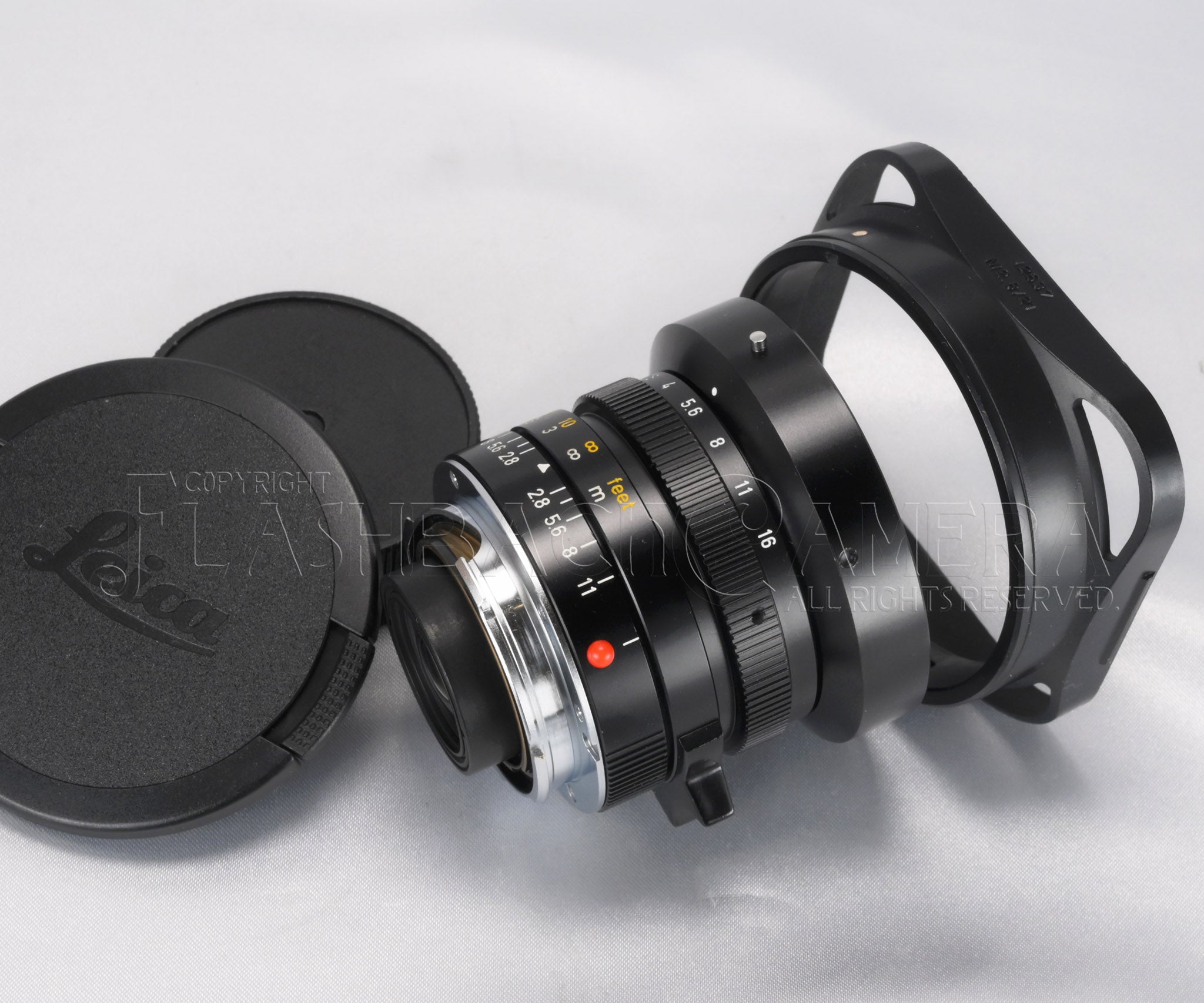 6群8枚構成。レトロフォーカス設計。後玉の出っ張りが無くなり、ライカM5やCLにも適合します。超広角ながらf2.8の明るさが確保されています。本品の最短撮影距離は0.7m(初期は非連動ながら0.4m)。フィルター径はE60。適合フードは12537。
