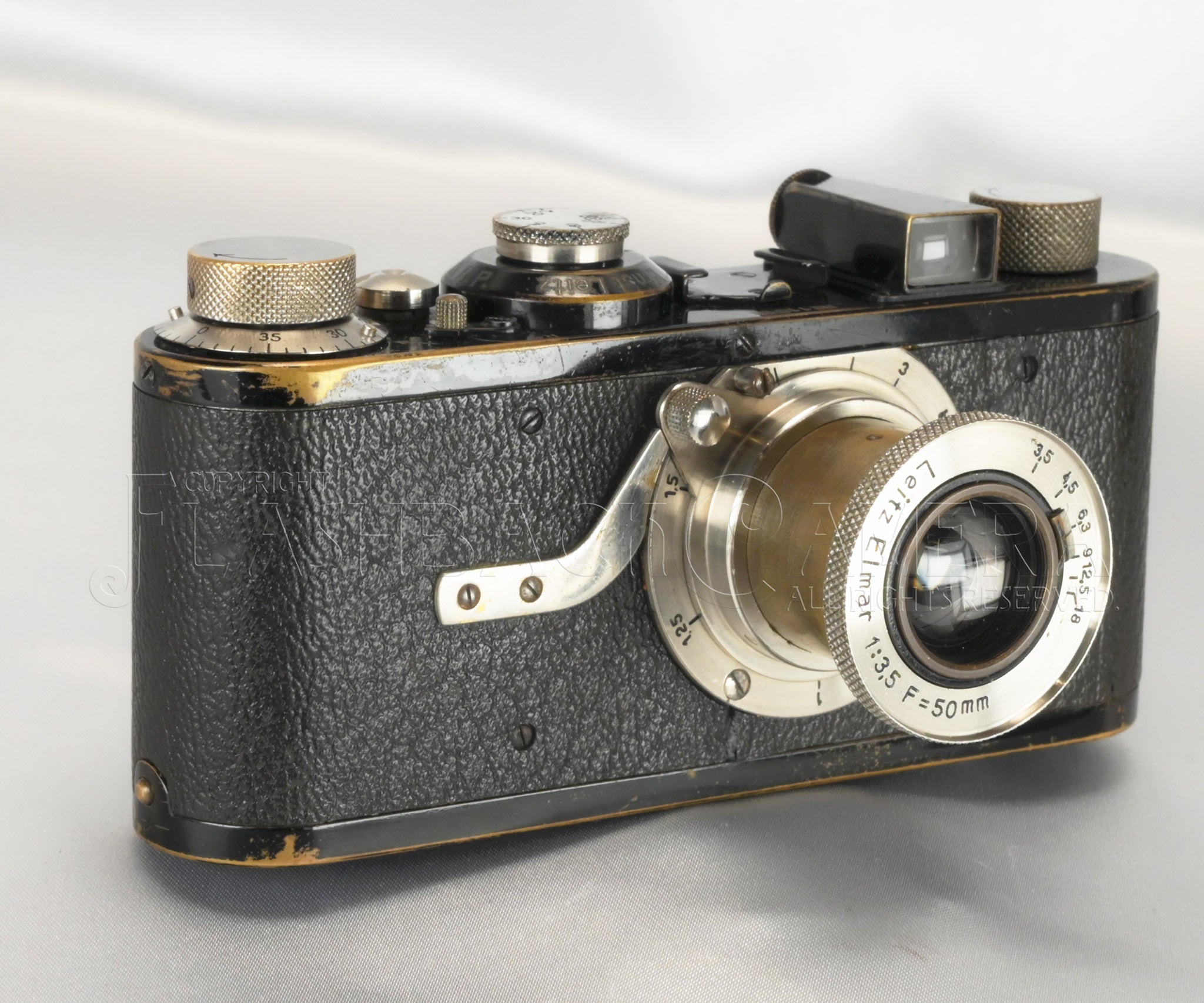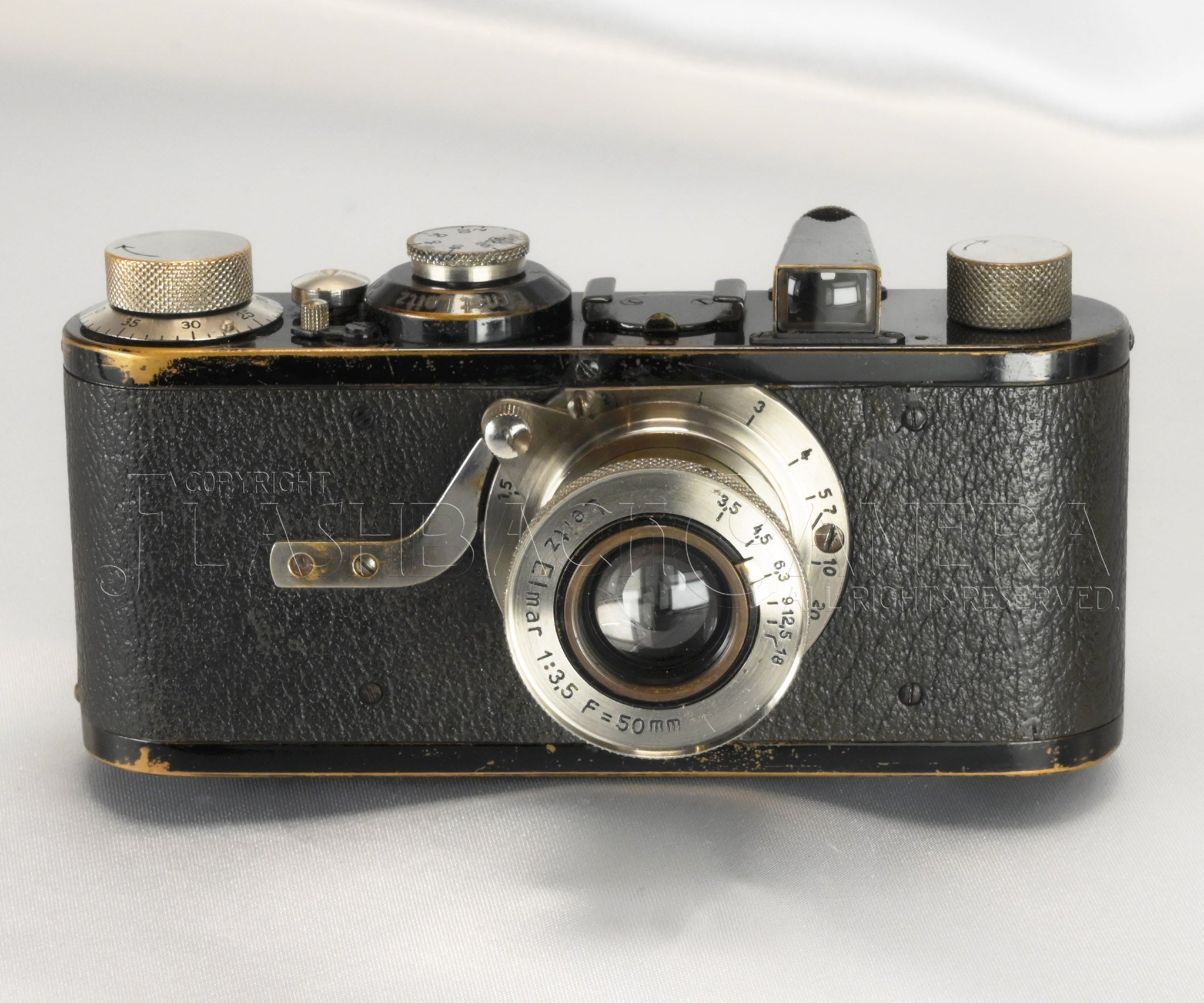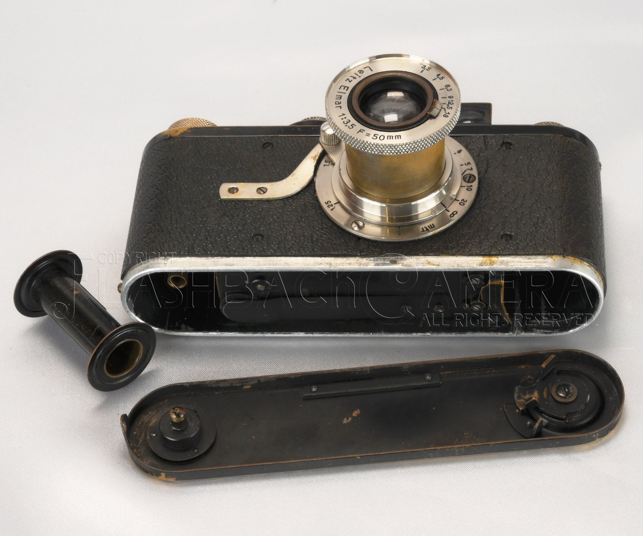 経た来た歳月なりの使用感は見られますが、巻上げや巻戻しノブは目の細かいローレット、Elmarの銘板は初期特有の小さいフォント、荒シボのグッタペルカ、カンヌキの底蓋ロックなどなど、各部のパーツは当時のオリジナルで、見どころ沢山。