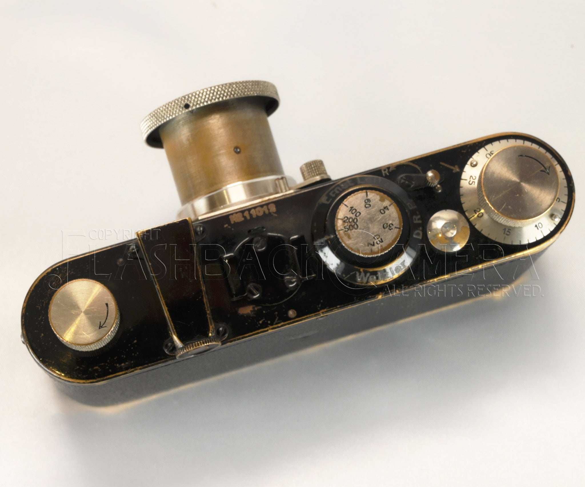 外観は各部に黒塗装剥げ、沈胴部に長年の使用によるメッキの剥げ、トップカバー上部の背面側に僅かな凹み修正跡一箇所、また正面右側にグッタペルカの補修跡が見られますが、オリジナルを保ったA型初期としてはまずまずのコンディション。