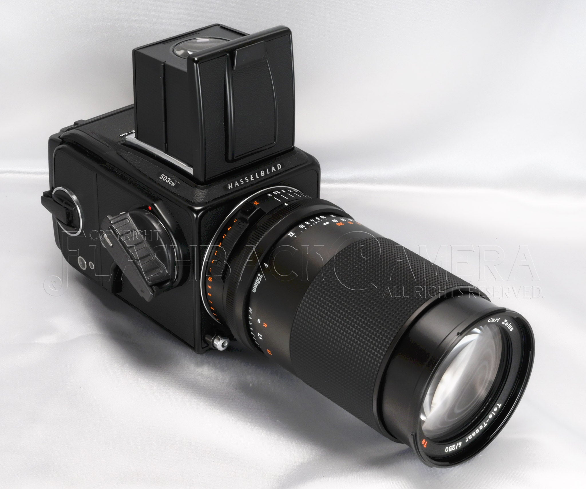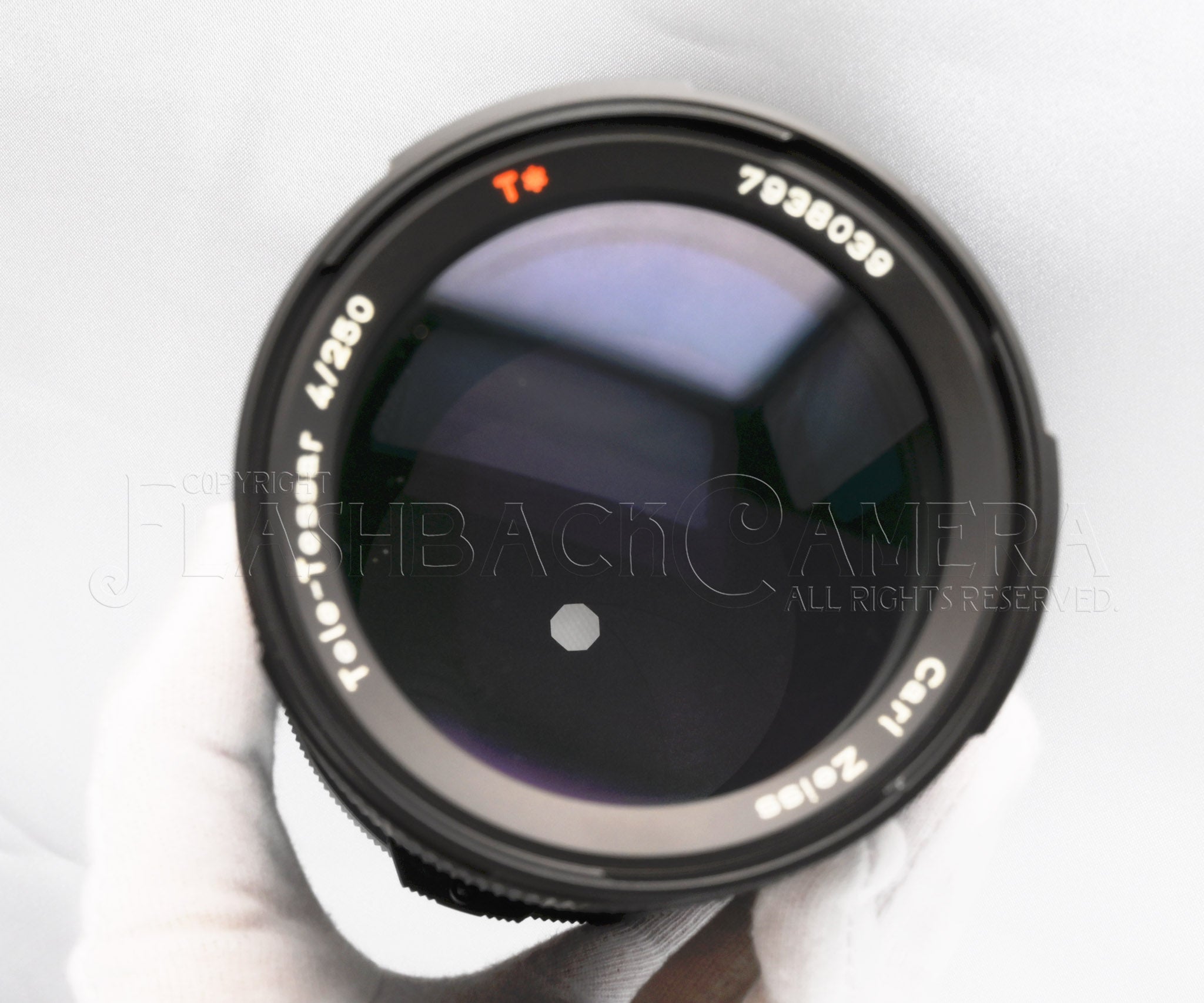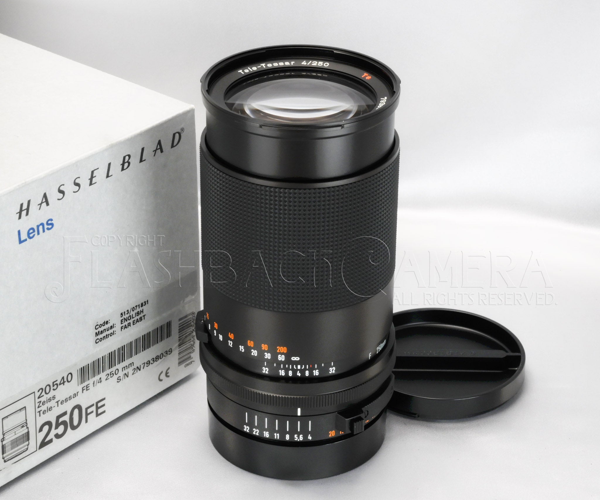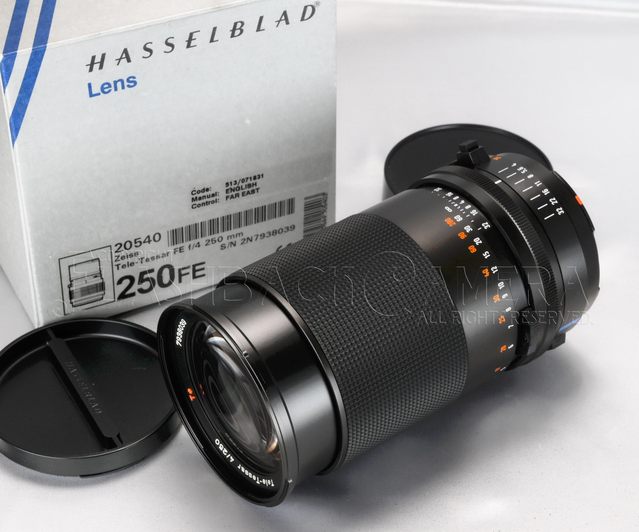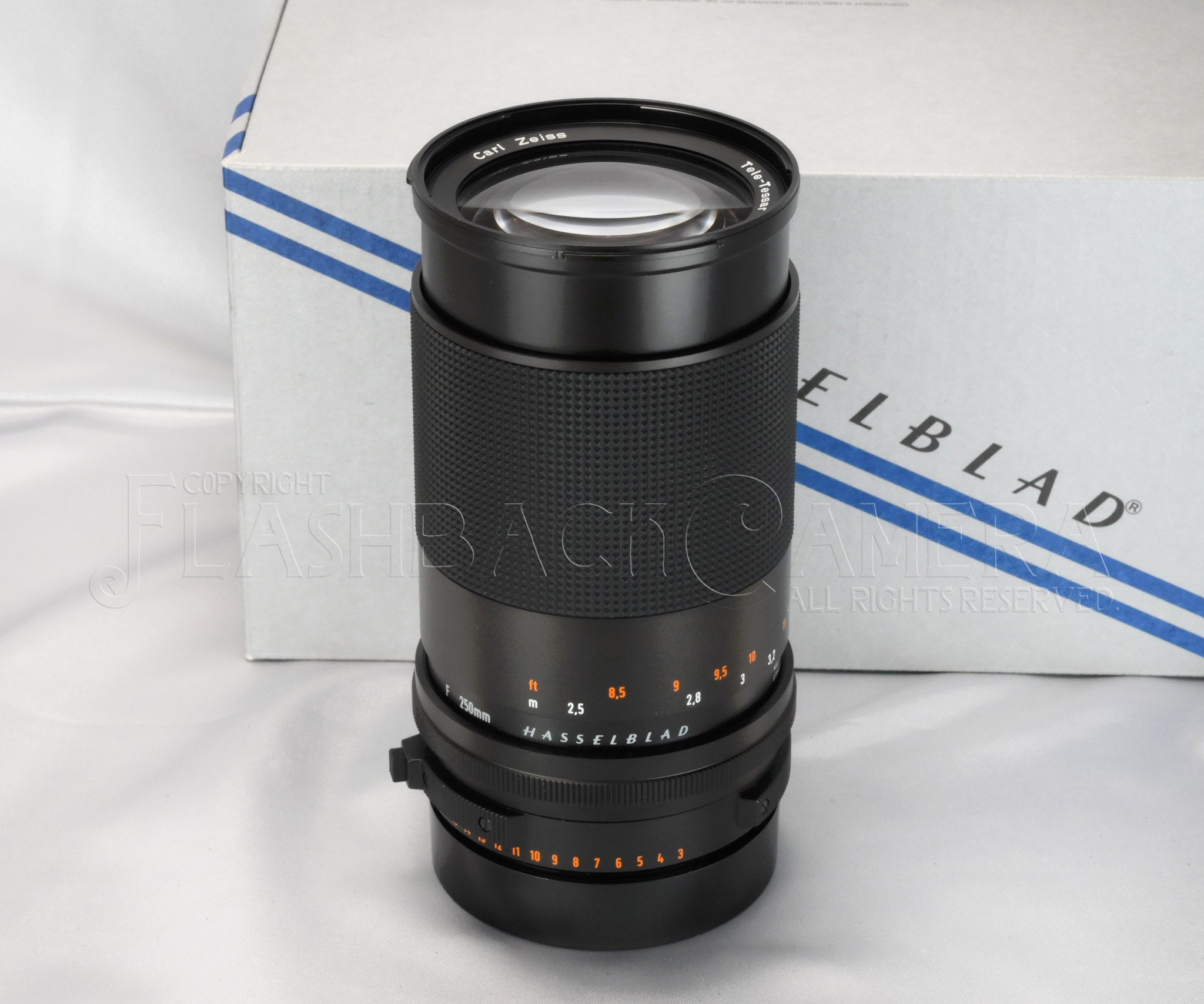 カールツァイス製テレ・テッサー FE 250mm f4。ハッセルブラッド205TTCなどのフォーカルプレーン機専用レンズです。FEレンズは1991年に登場し、2002年まで製造されました。テレテッサー 250mmは、2,000本程度が供給されたと言われています。本品は1996年製です。